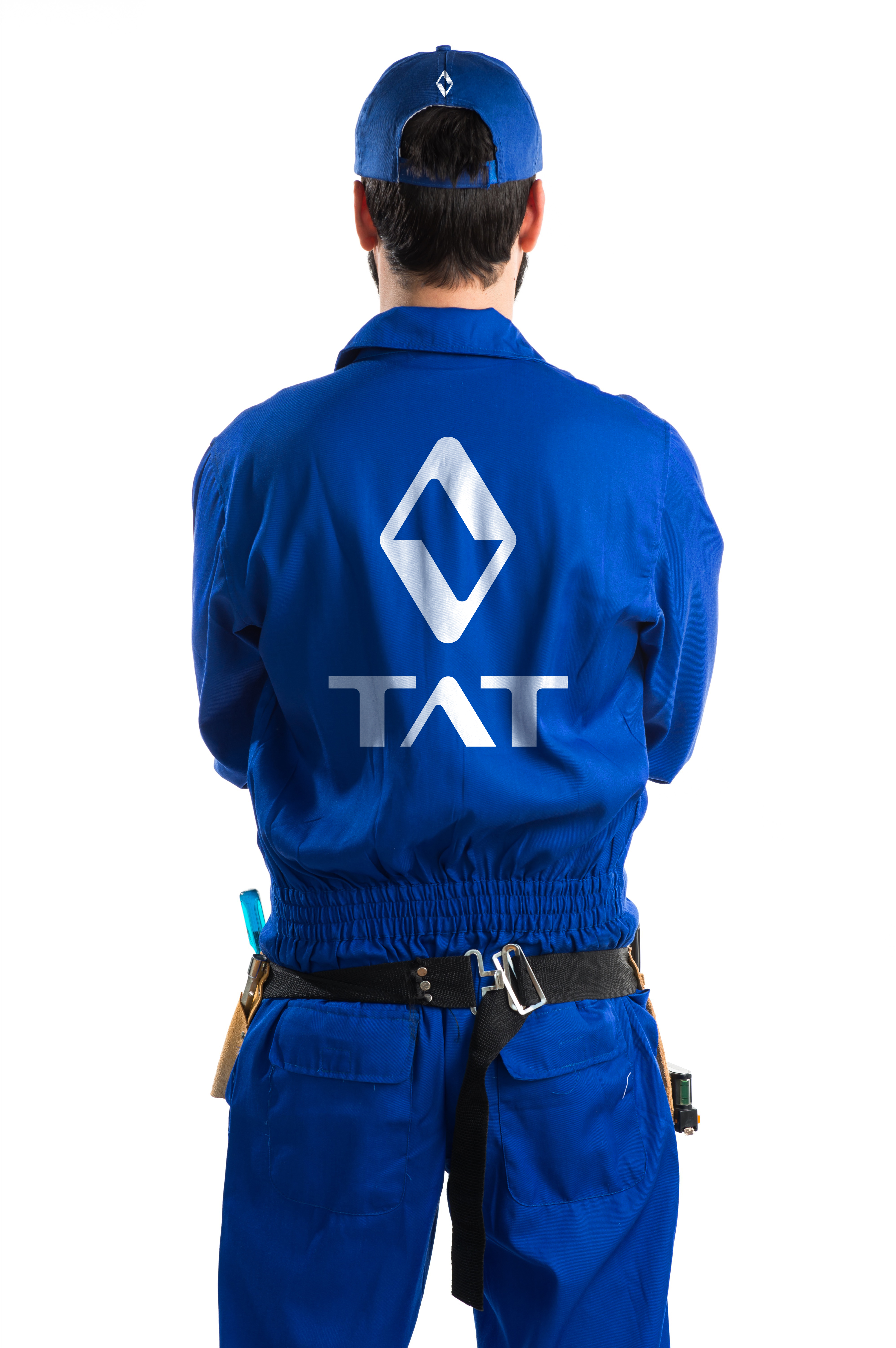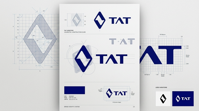 Lo más sofisticado de este diseño es su origen orgánico: el rayo y el diamante no son formas externas, nacen de nuestra propia tipografía. Se forman mediante la convergencia de dos "A" de TAT. Una normal y otra rotada 180 grados, interactuando en un espacio negativo perfecto. Esta fusión tipográfica-geométrica simboliza la cohesión de nuestro equipo y la integración perfecta entre el diseño técnico (la estructura) y la energía que lo atraviesa.