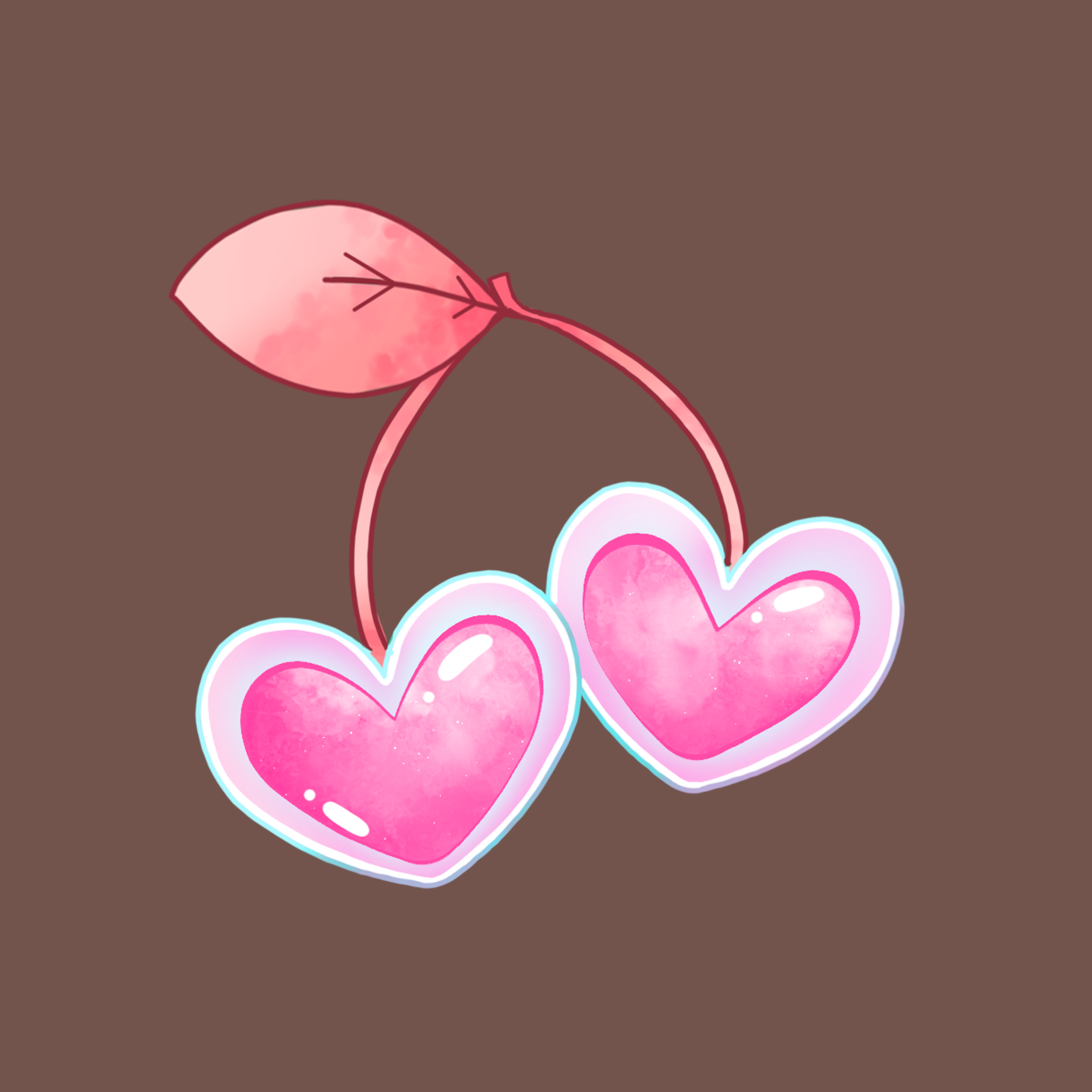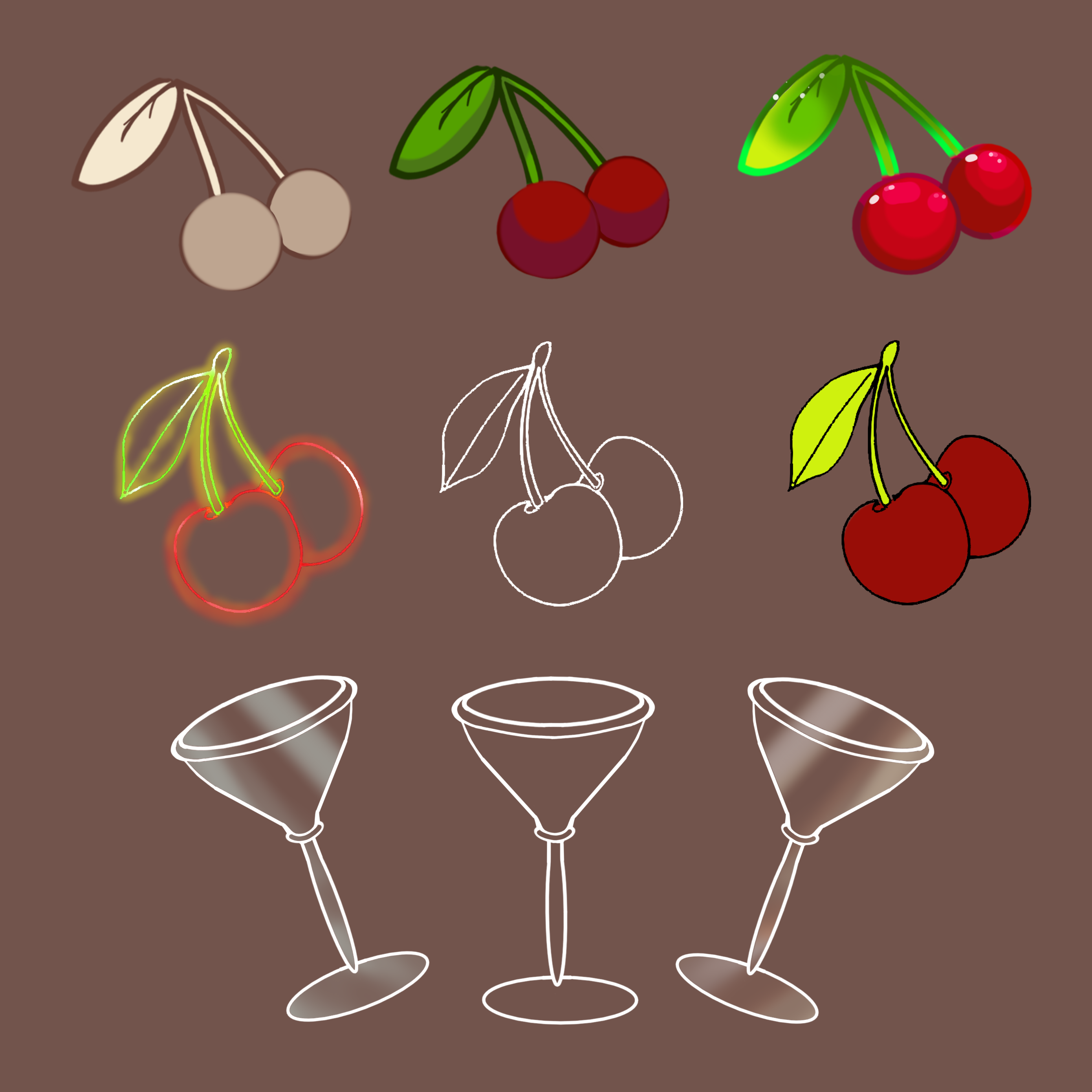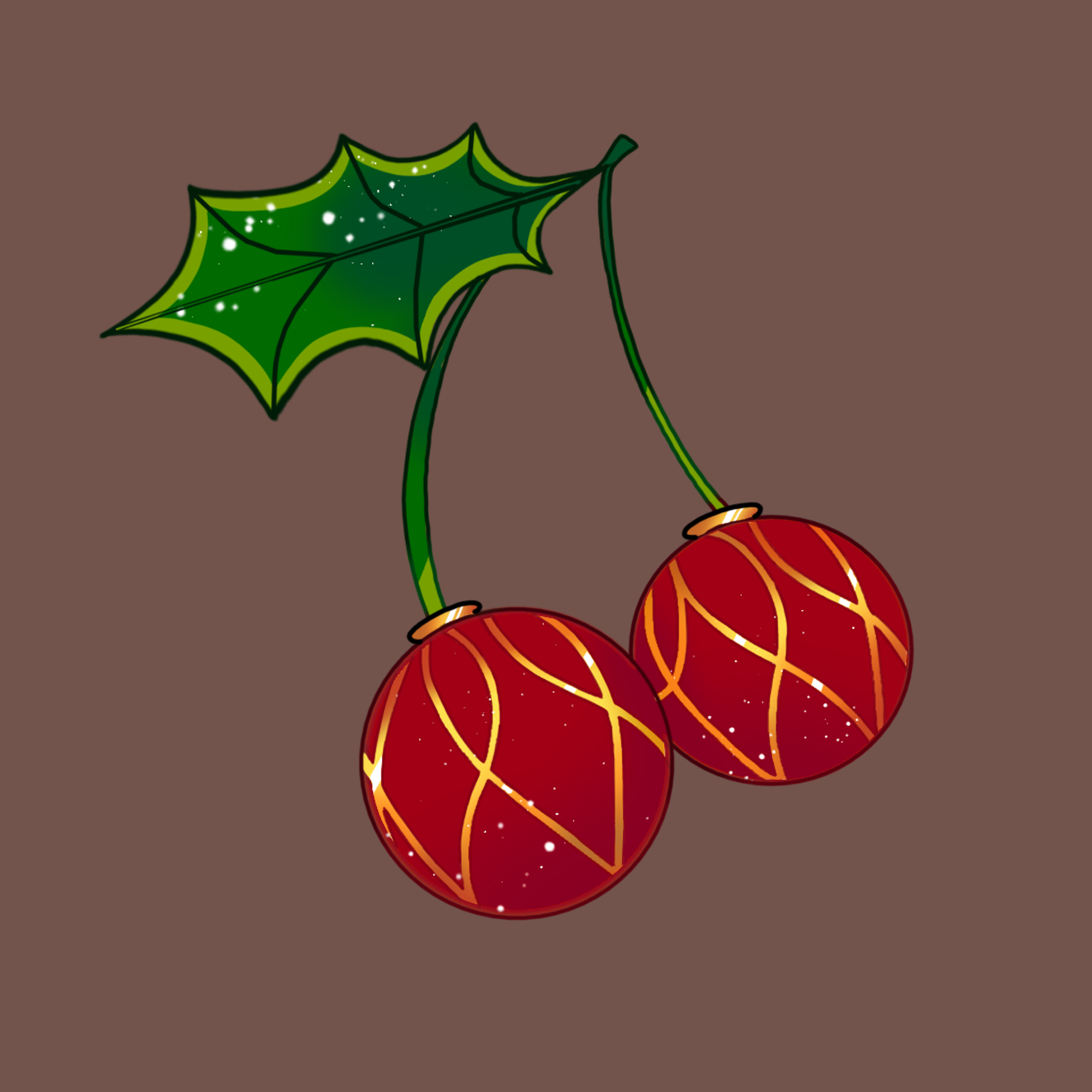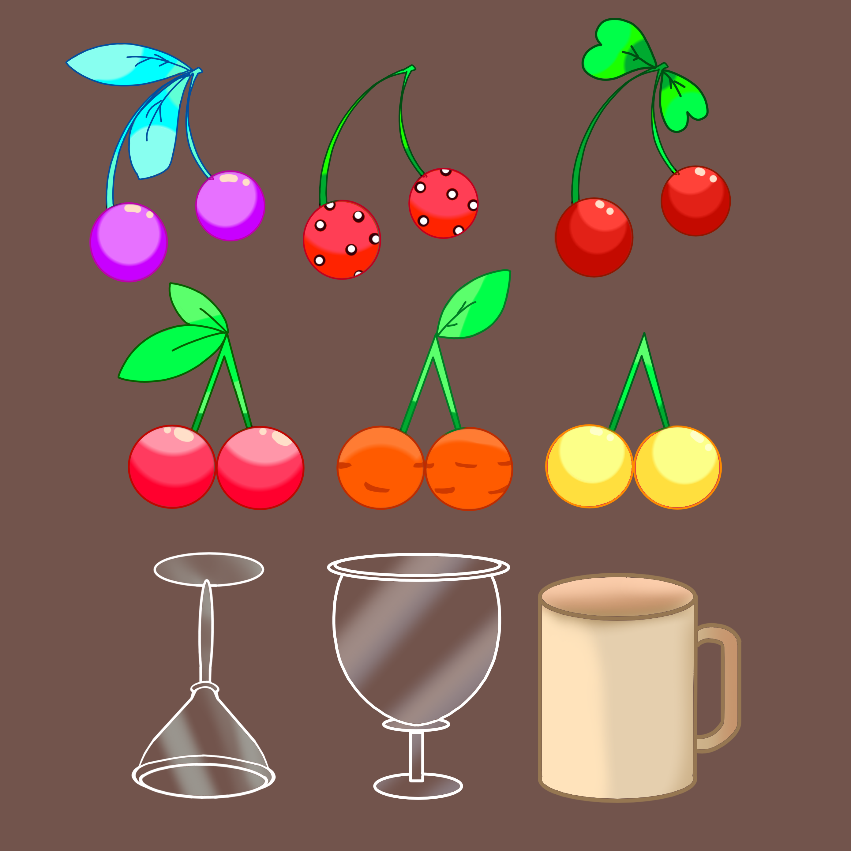 Kers 1: houd zich niet aan het kleuren palette, heeft een blaadje teveel en de rechter kers hangt niet voor de ander.