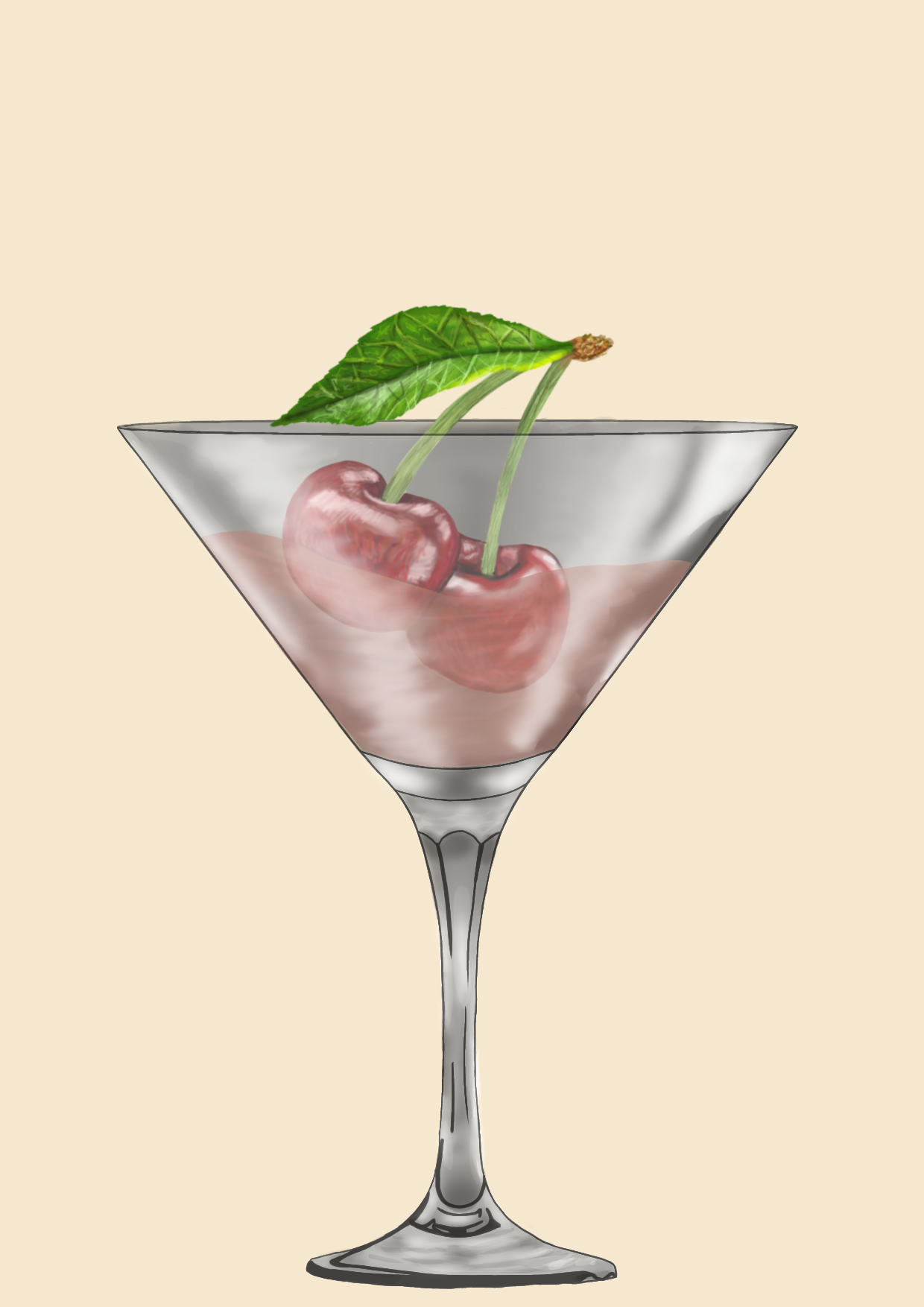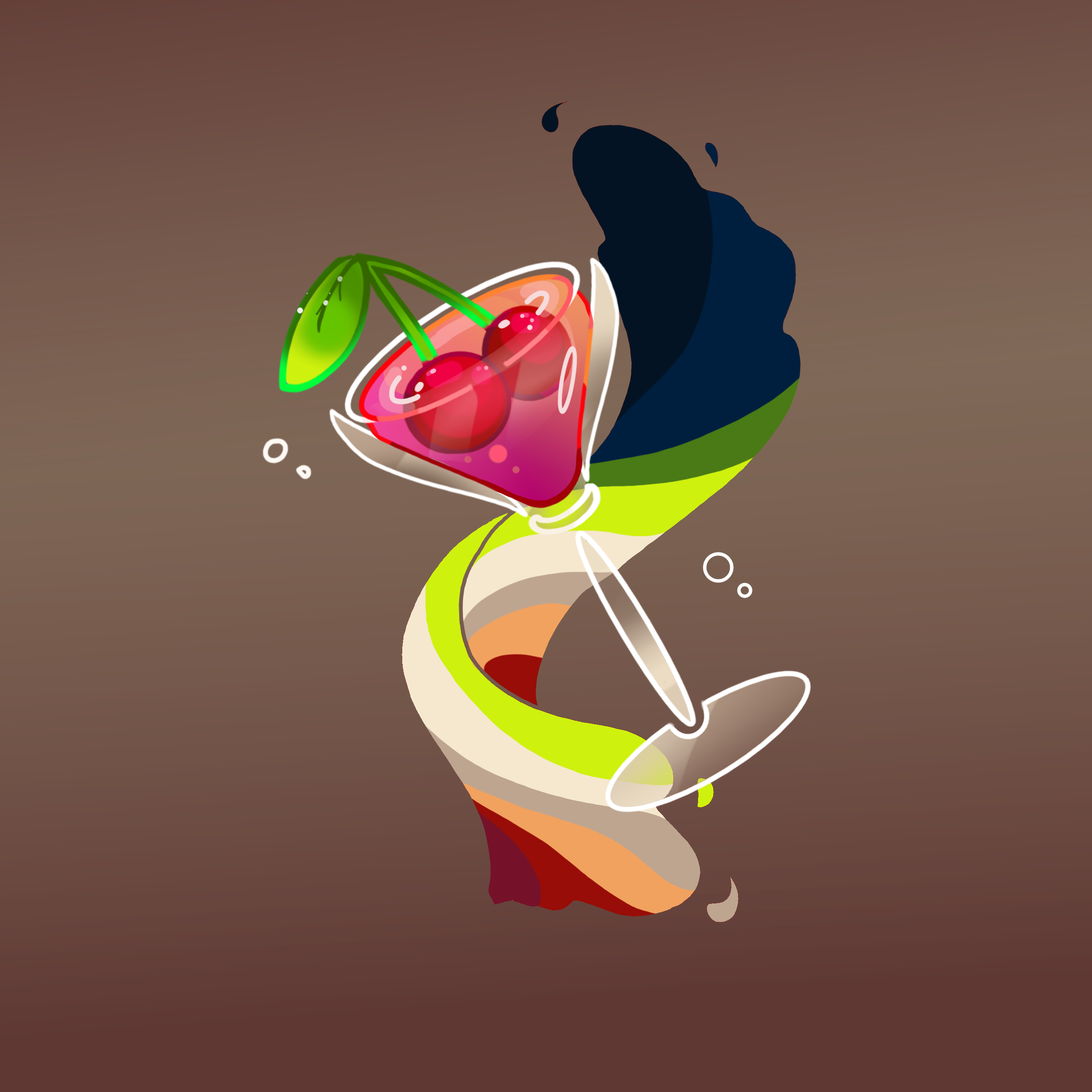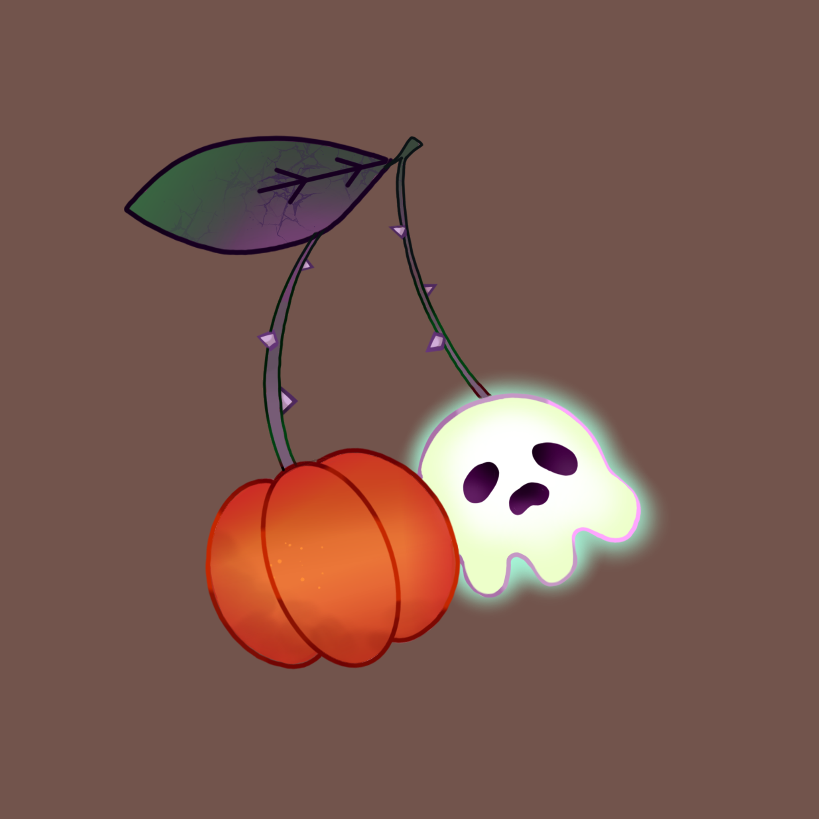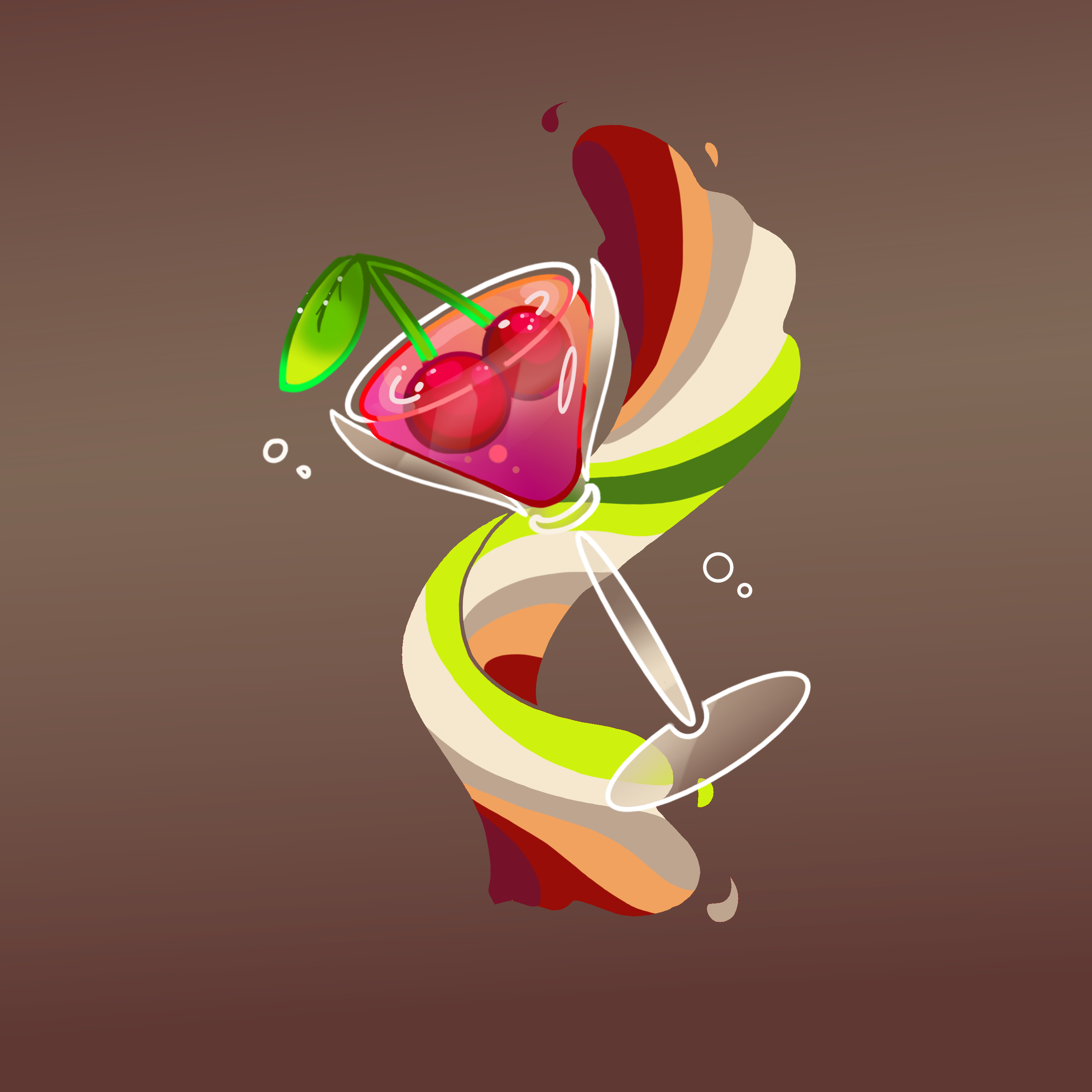 Kers 1: houd zich niet aan het kleuren palette, heeft een blaadje teveel en de rechter kers hangt niet voor de ander.