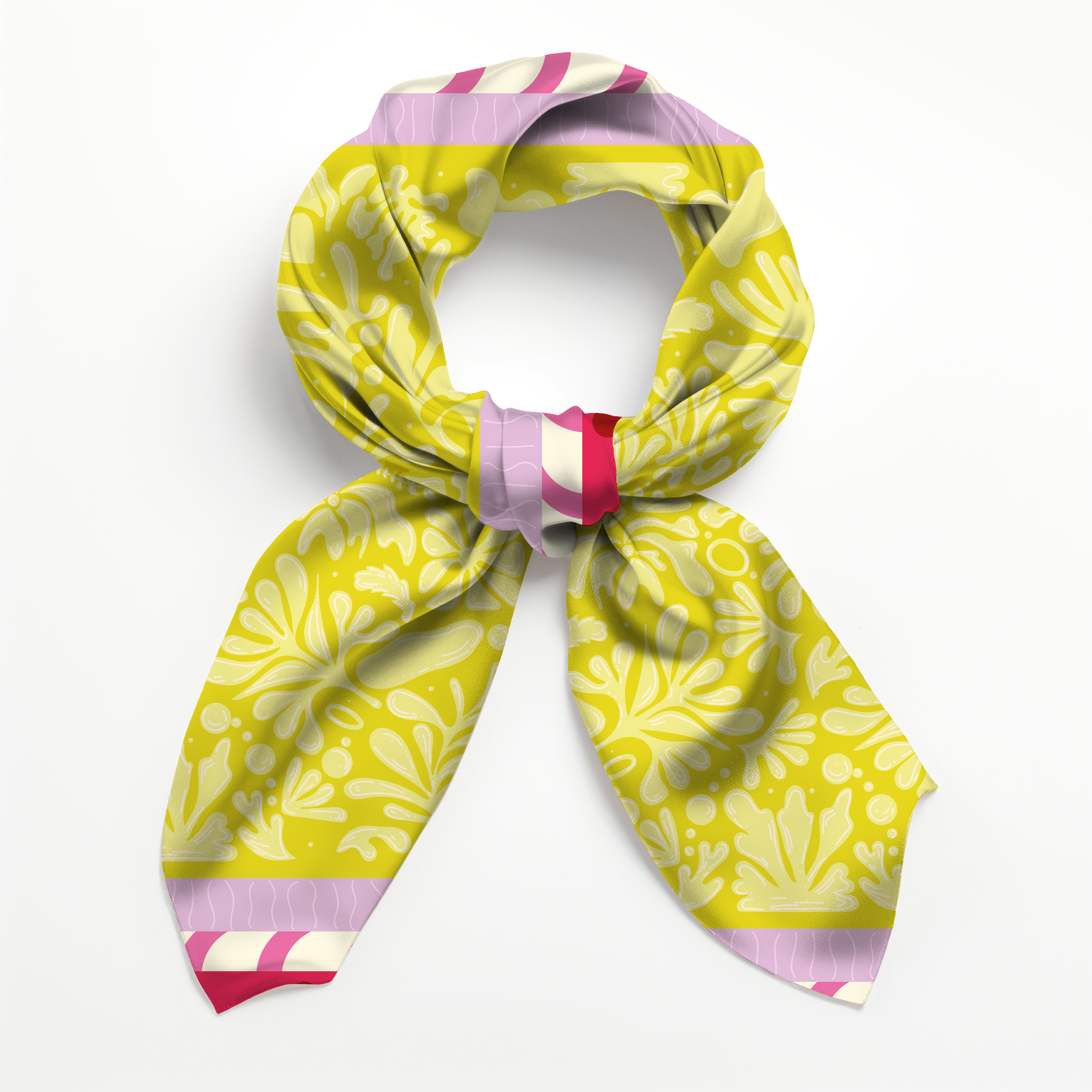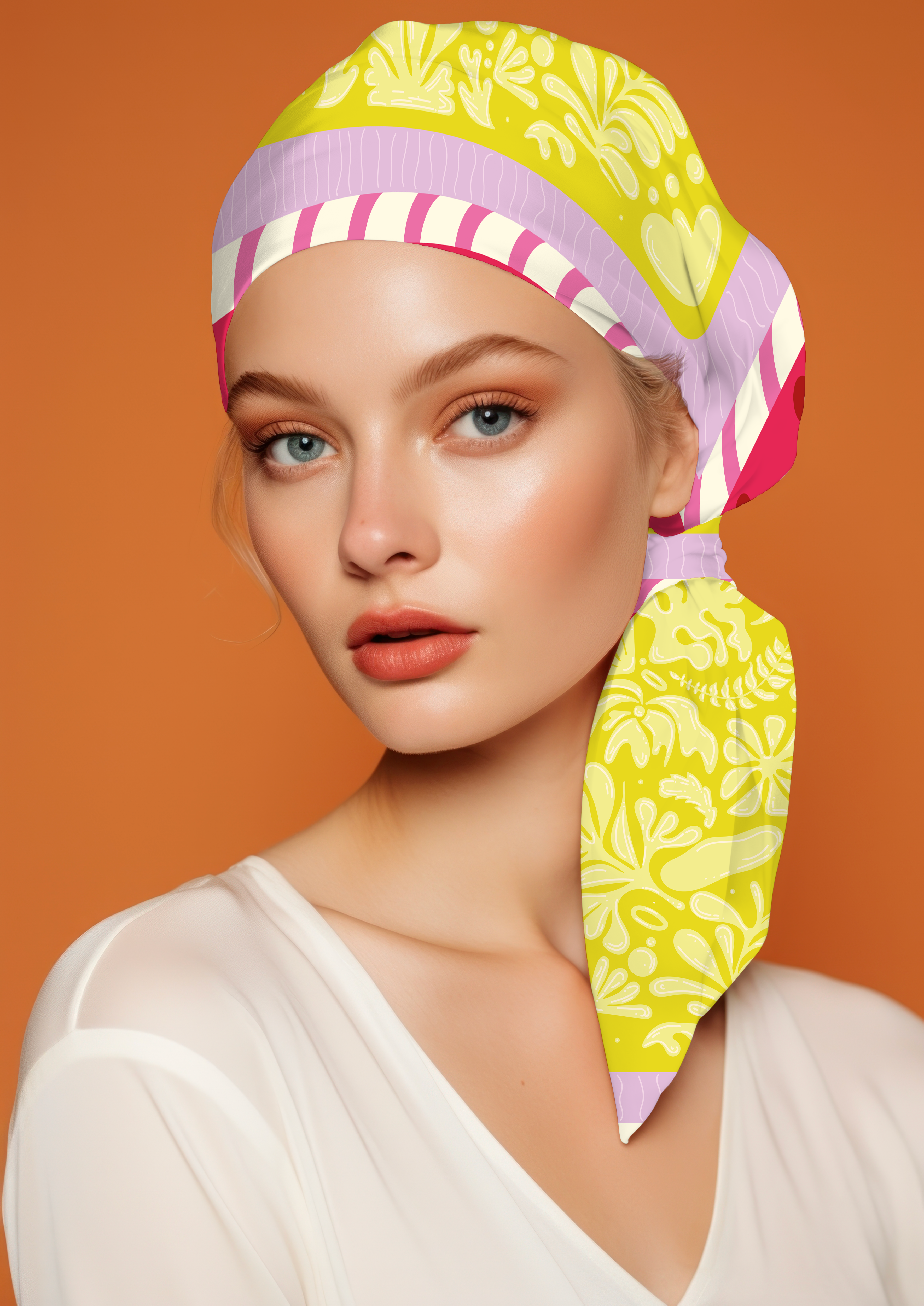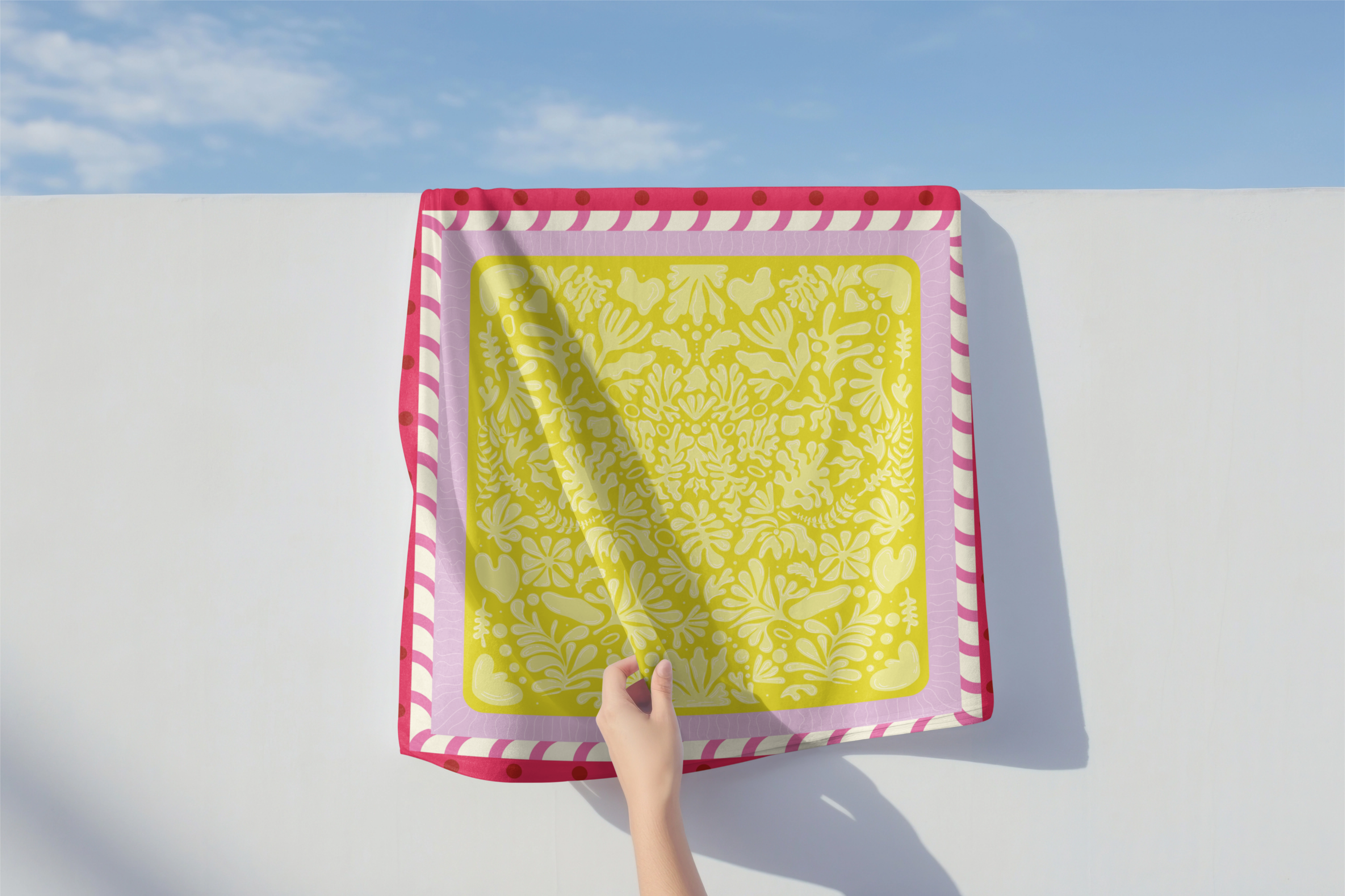 La cápsula está compuesta por un set tipo unboxing que incluye una pañoleta estampada con un print propio de colores vivos —una pieza protagonista pensada para elevar cualquier look— y un complemento funcional a escoger entre cosmetiquera o estuche para cables, elaborados en cuerina PVC color beige, limpios, versátiles y atemporales.