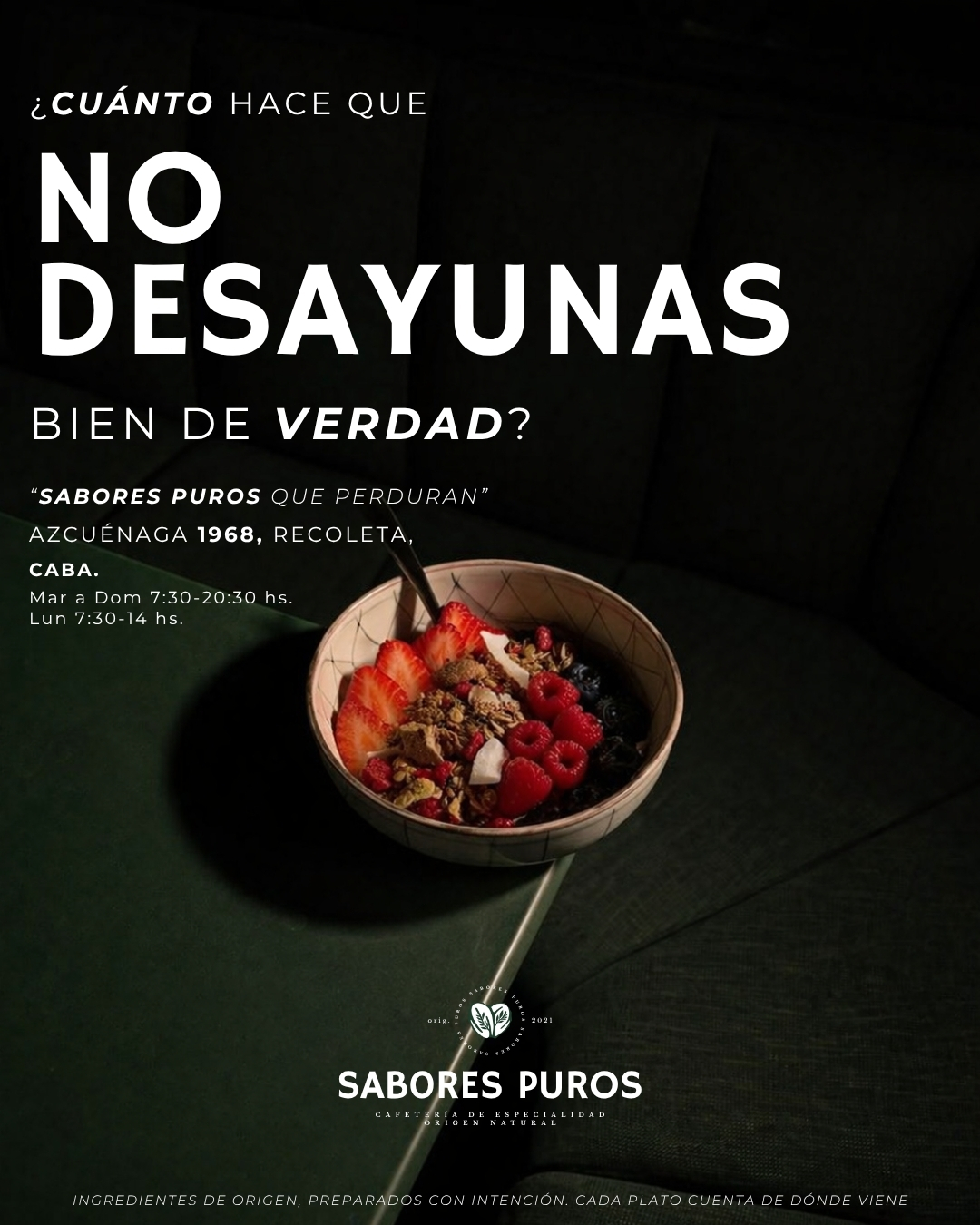 El nombre "Sabores Puros" nos da permiso para ser lo opuesto a los cafés industriales: materia prima honesta, preparación cuidada, estética que lo transmite todo antes de que pruebes el primer sorbo.