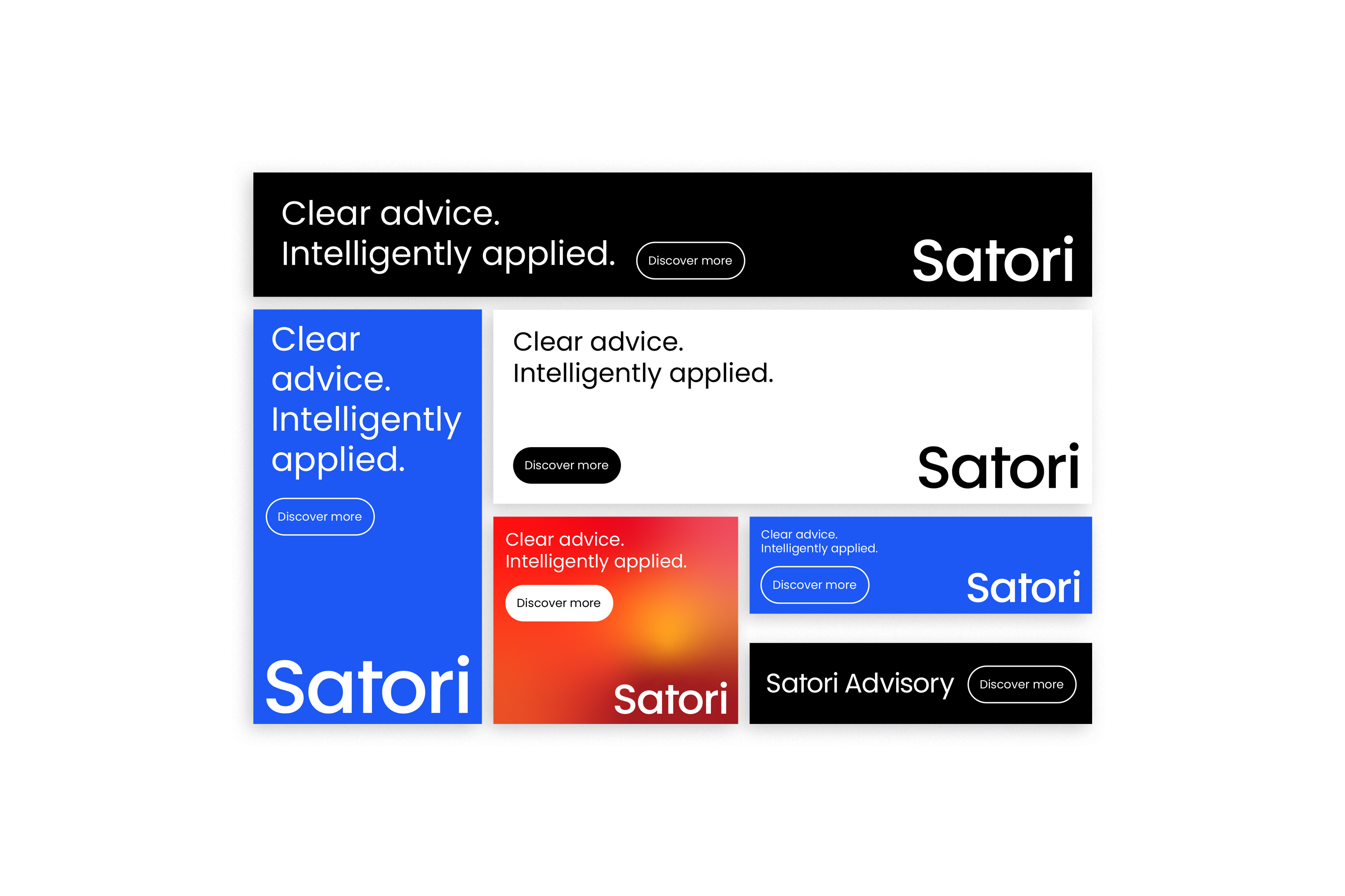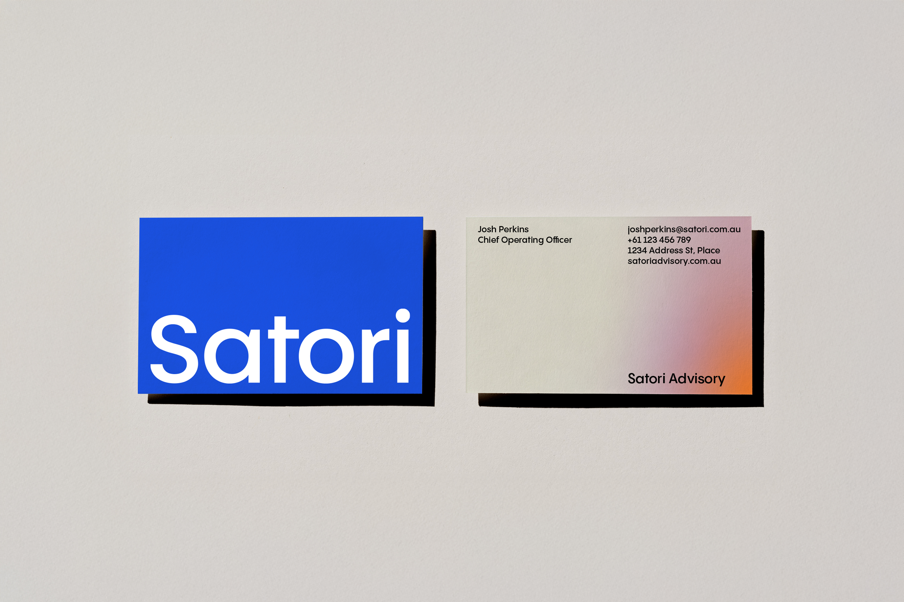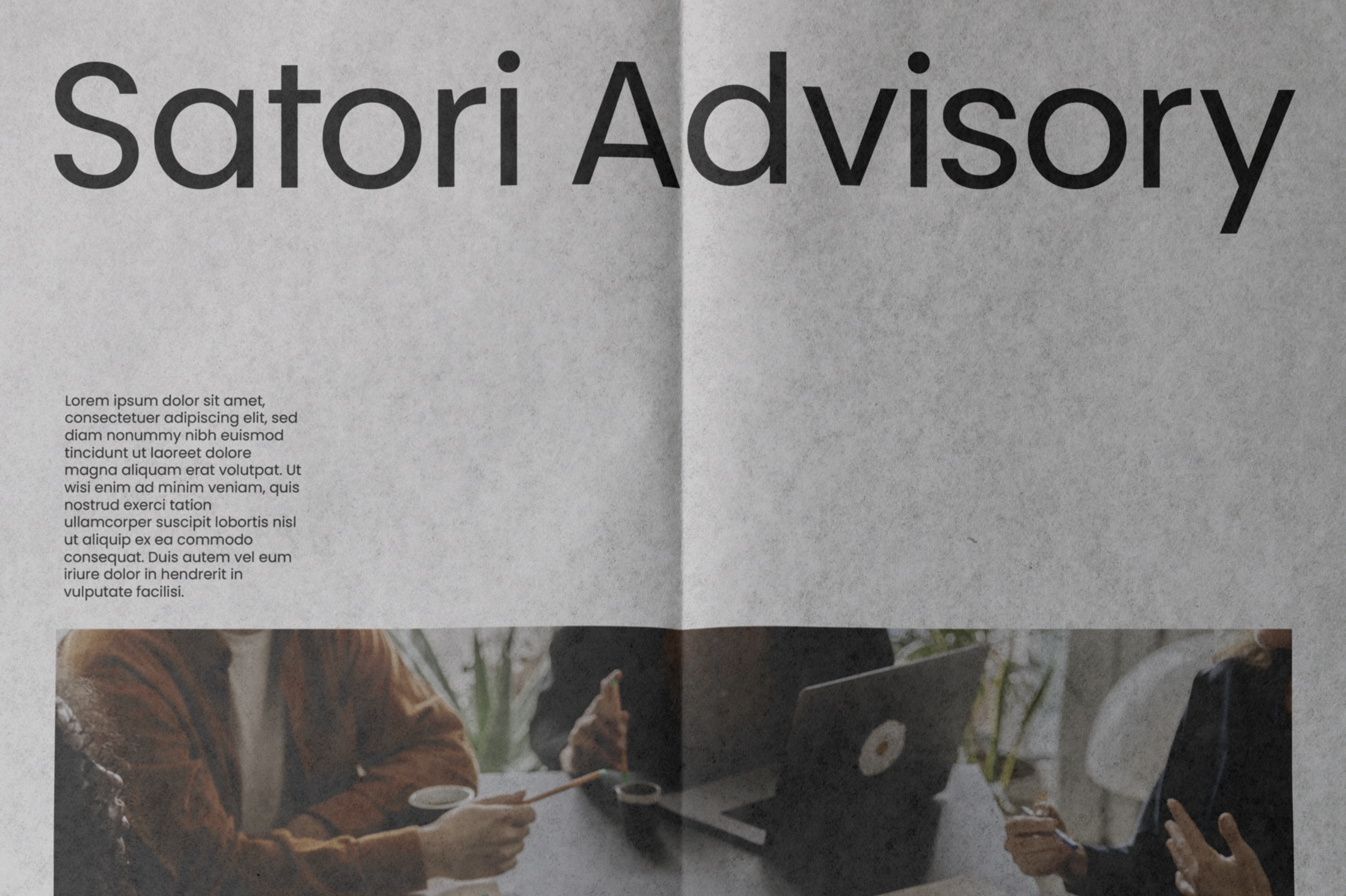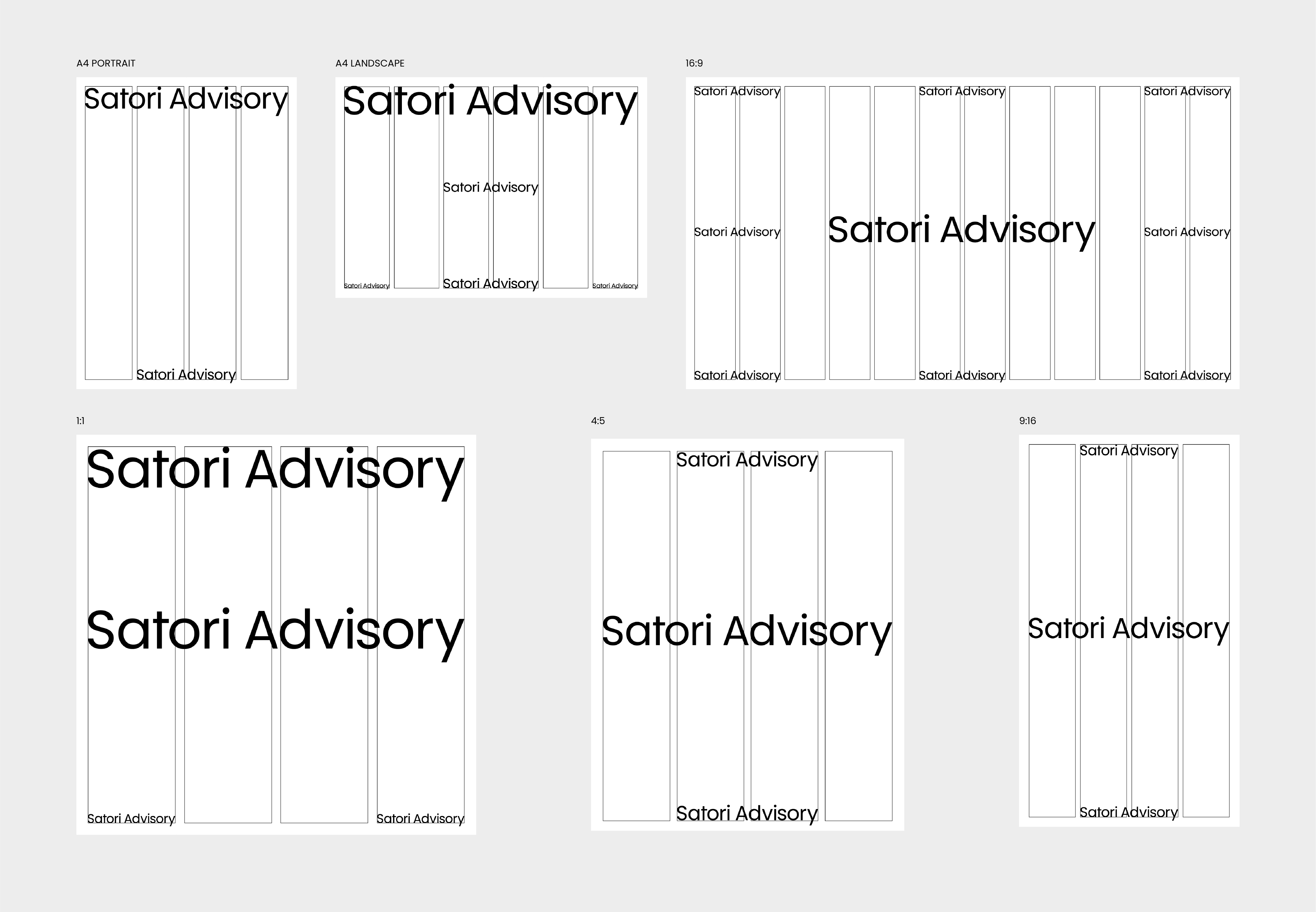 Two versions exist: the primary wordmark "Satori," used wherever the brand is well established, and the extended wordmark "Satori Advisory," used when the full name of the business needs to be present — in formal documents, introductory materials, or any context where the descriptor adds necessary clarity. In the extended version, "Advisory" appears in Poppins Regular, creating a natural hierarchy within the lockup without introducing a second typeface.