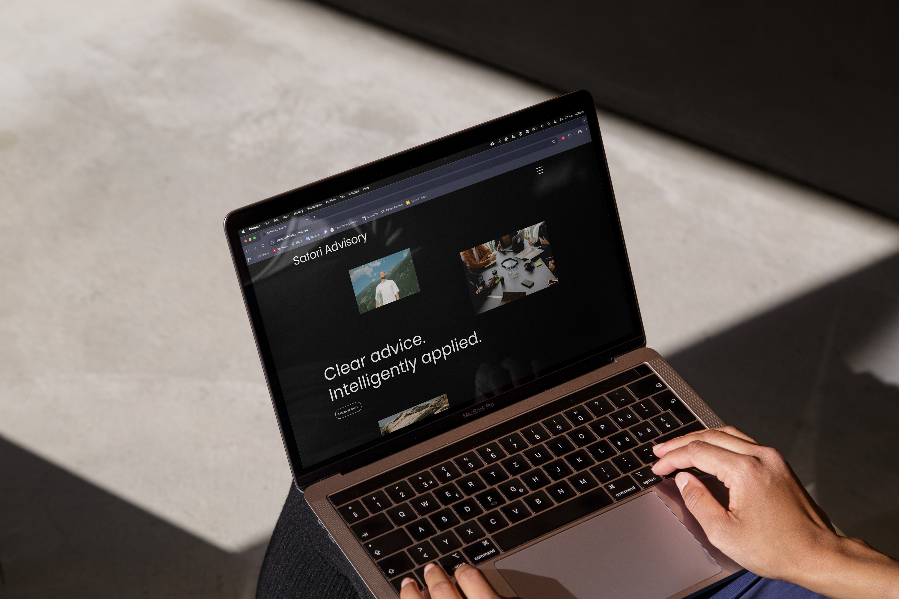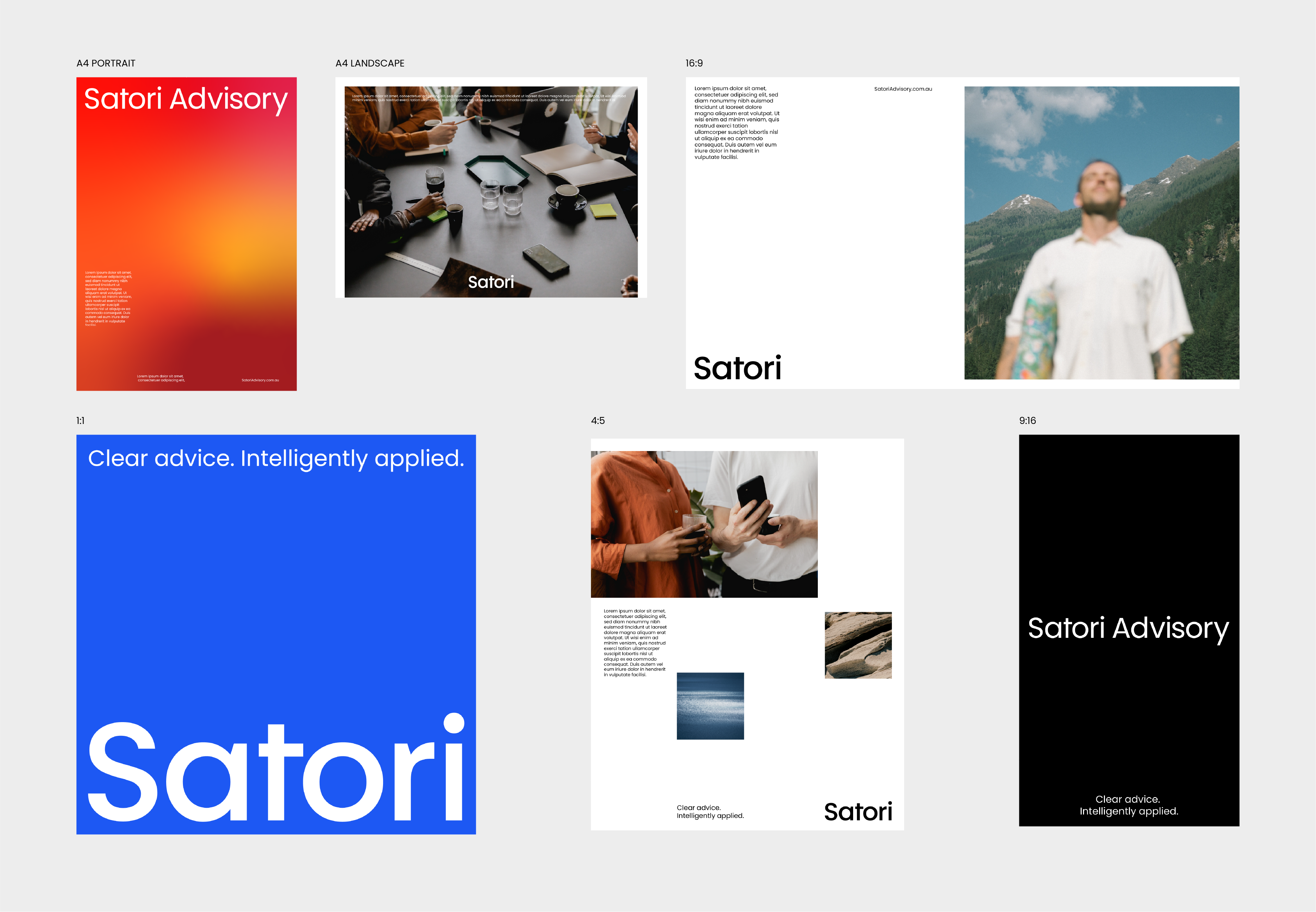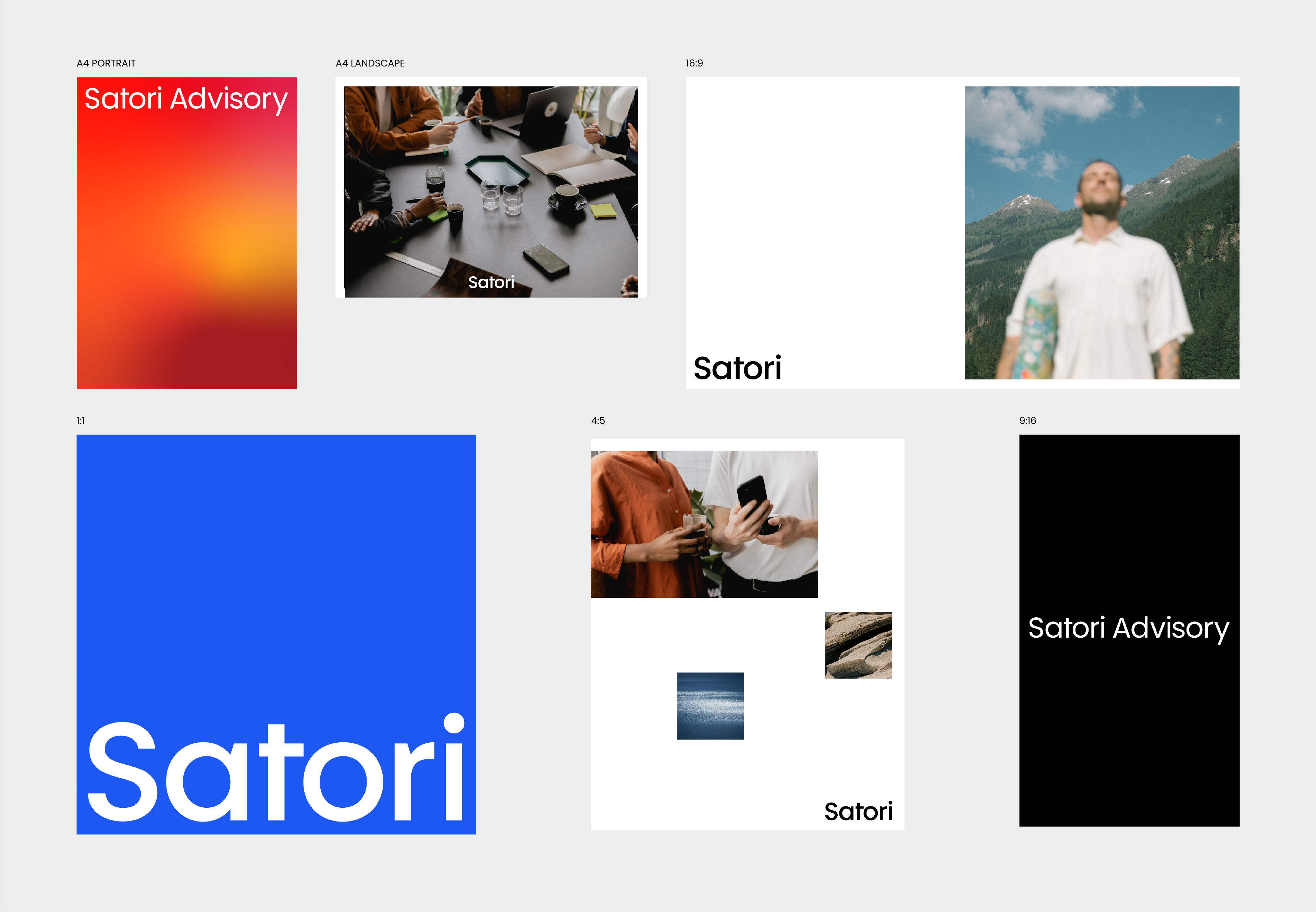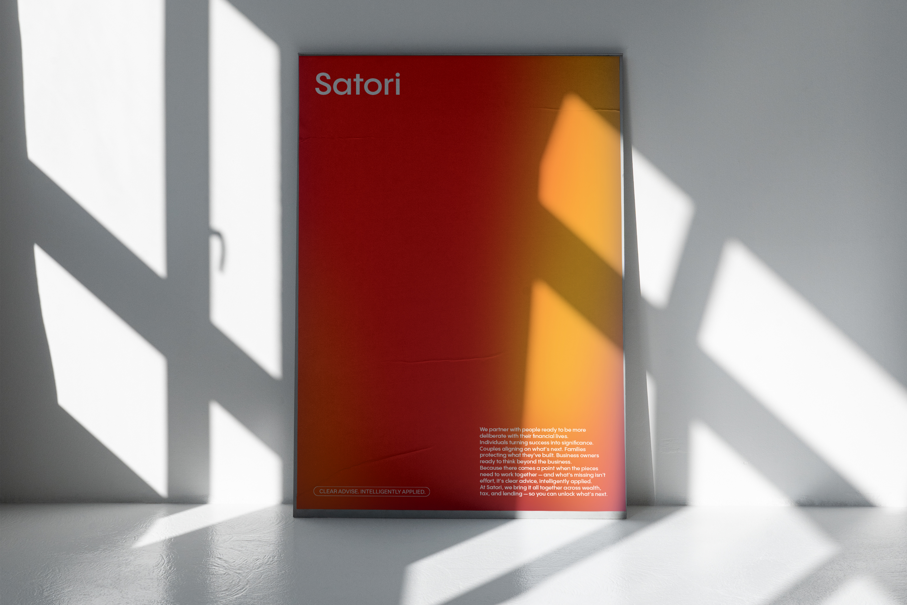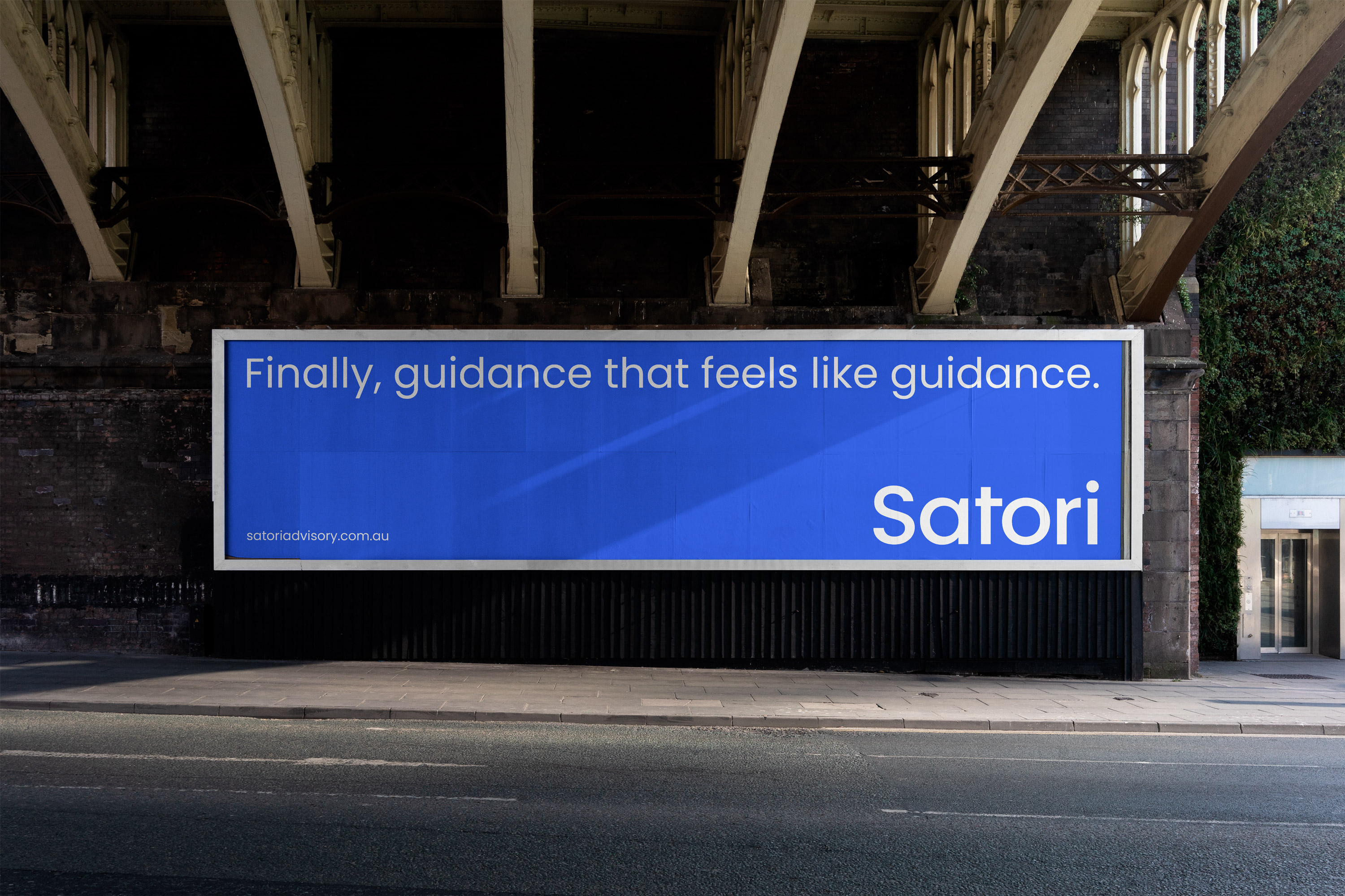 Two versions exist: the primary wordmark "Satori," used wherever the brand is well established, and the extended wordmark "Satori Advisory," used when the full name of the business needs to be present — in formal documents, introductory materials, or any context where the descriptor adds necessary clarity. In the extended version, "Advisory" appears in Poppins Regular, creating a natural hierarchy within the lockup without introducing a second typeface.